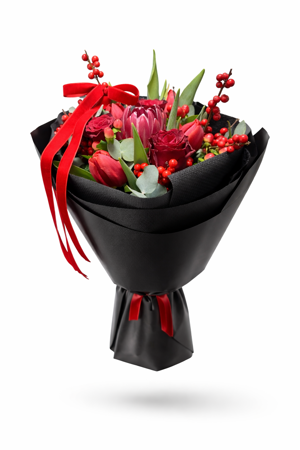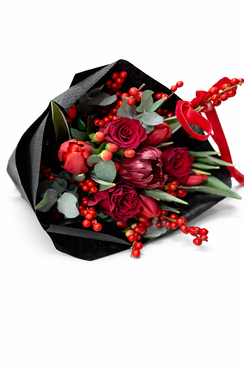 A csokorban rózsák, tulipánok, ilex ágak, hypericum valamint eukaliptuszok talalhatóak.