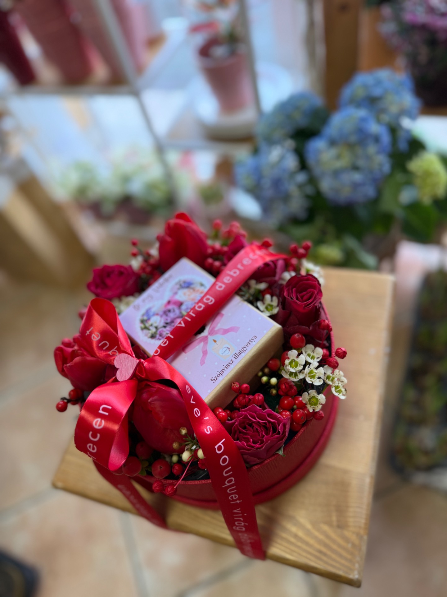 Szenvedélyes piros színben pompázó vegyes virágokból álló box, egy sóskaramell illatú 120 gr szójagyertyával a közepén. Kettő az egyben ajandék ❤️